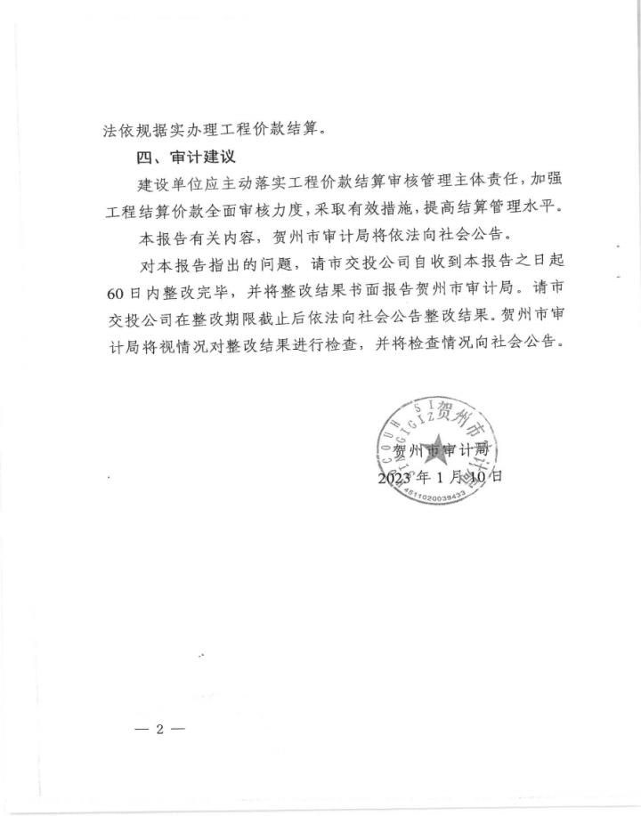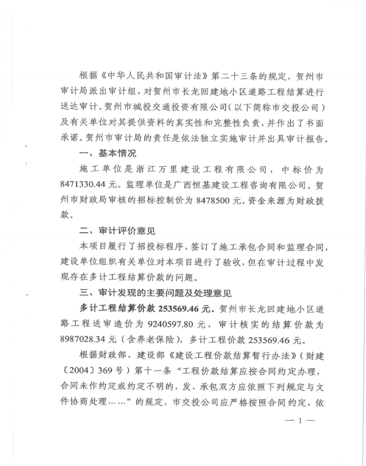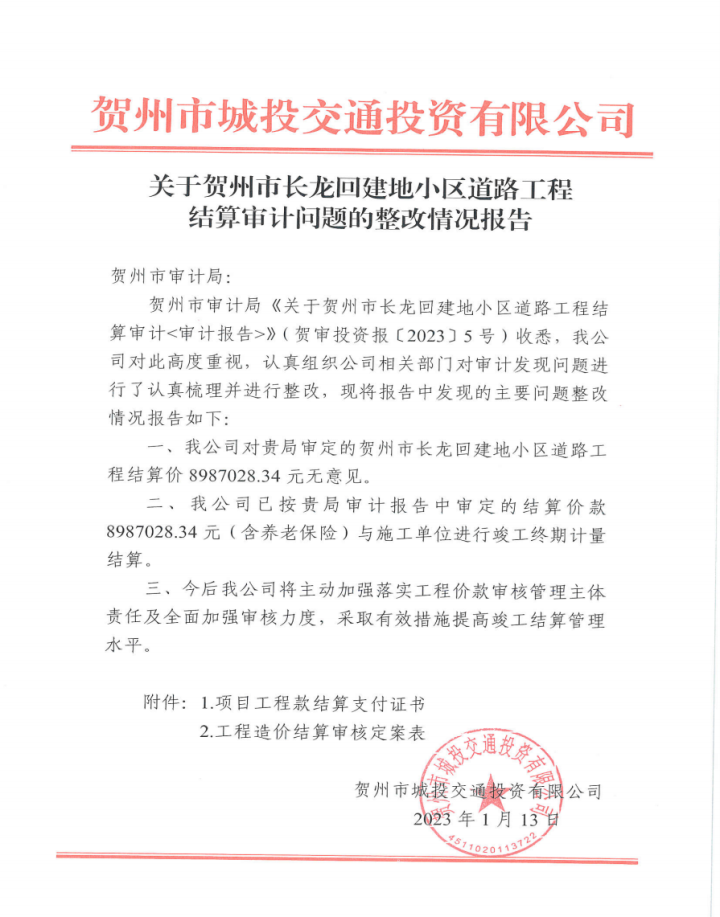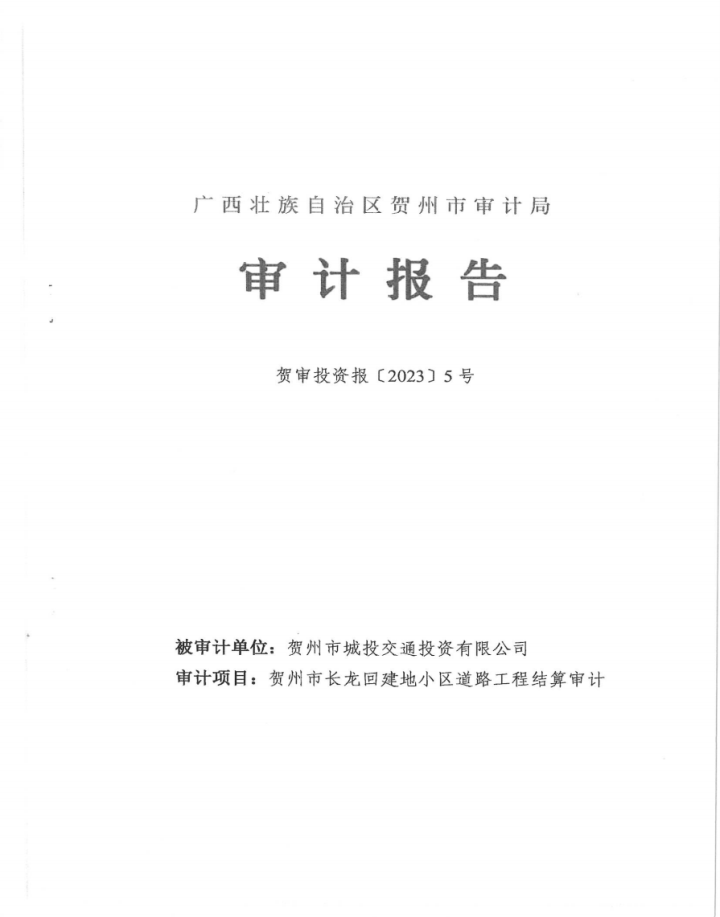 城投集團(tuán)關(guān)于賀州市長(zhǎng)龍回建地小區(qū)道路工程結(jié)算審計(jì)整改情況報(bào)告公示