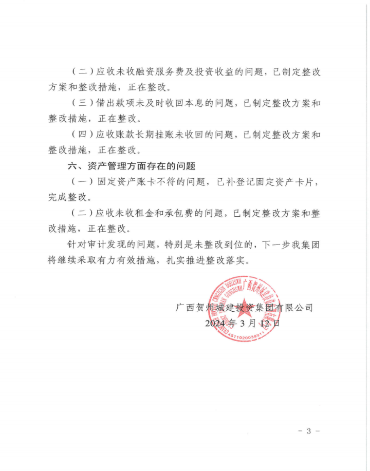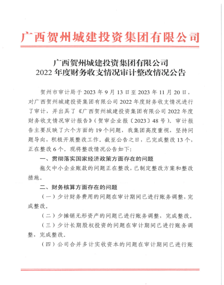 廣西賀州城建投資集團(tuán)有限公司2022年度財(cái)務(wù)收支情況審計(jì)整改情況公告